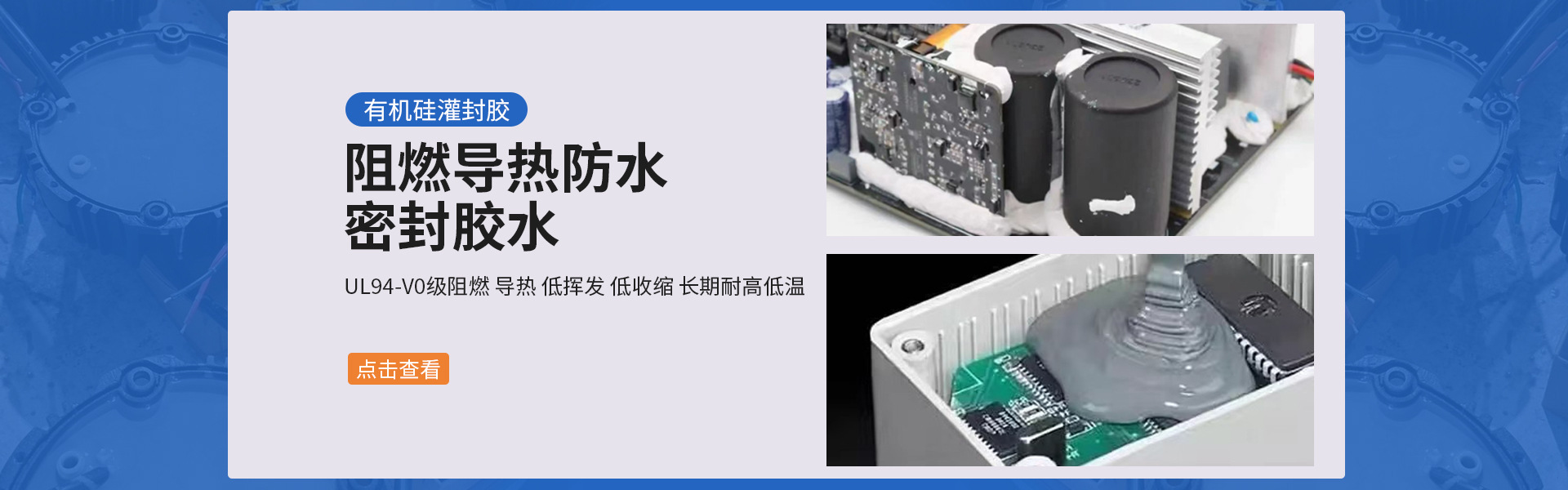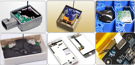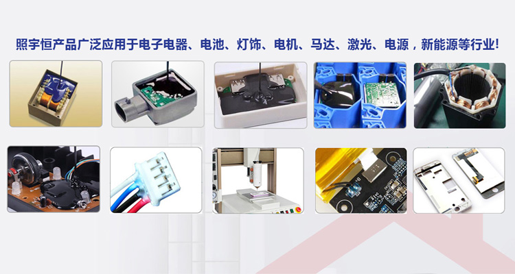 用于電子元器件的粘接、密封和封裝保護(hù),固化后可以起到防水、防潮、防塵、絕 緣、導(dǎo)熱、密封、防腐蝕、耐溫、防震等作用,能提高電子電器元件使用性能,強(qiáng)化電子 器件的整體性,提高對(duì)外來(lái)沖擊、震動(dòng)的抵抗力,提高內(nèi)部元件、線(xiàn)路間絕緣性。