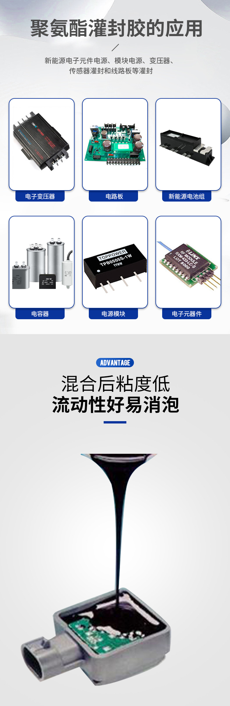 ● 廣泛應(yīng)用于變壓器、電器,AC電容、高壓包、負(fù)離子發(fā)生器、水族水泵、點(diǎn)火線(xiàn)圈、電源模塊、電子控制器及其它電子元器件的灌封;